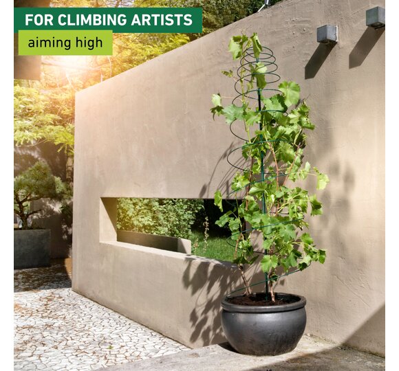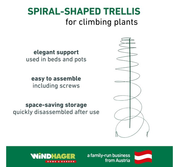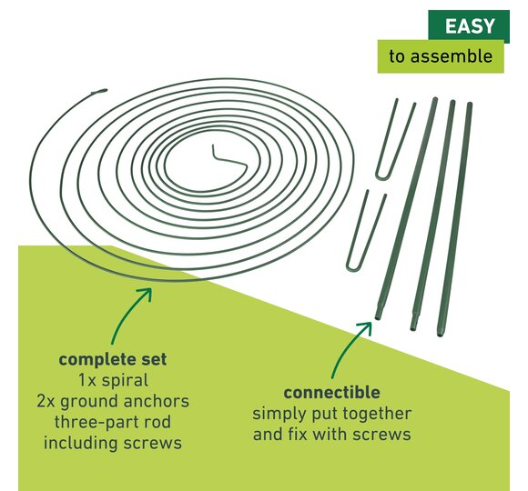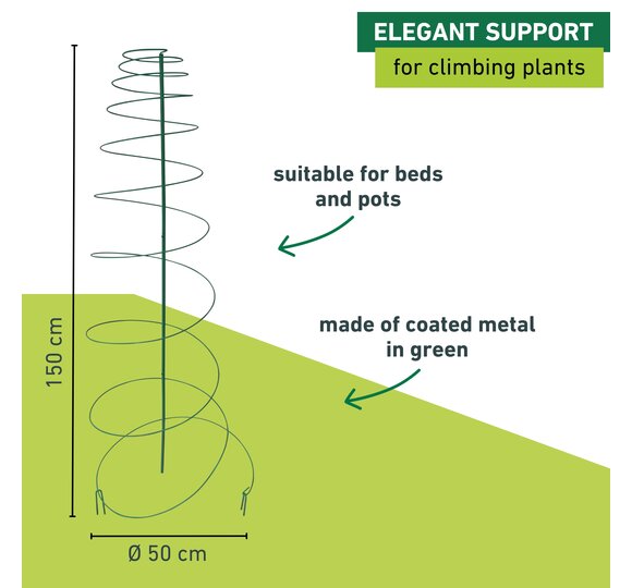 Suitable for beds or pots. The 3-part, connectible rod serves as a support for the wire spiral, which gives your plants a lovely and even appearance. The two ground anchors are included, so that you can start straight away. The trellis spiral is easy to assemble and demountable e.g. in autumn and can be stored in a space-saving way.