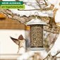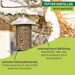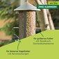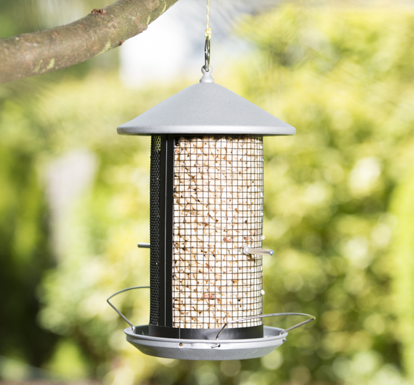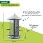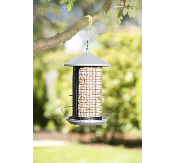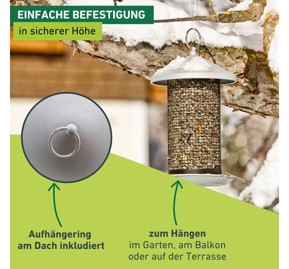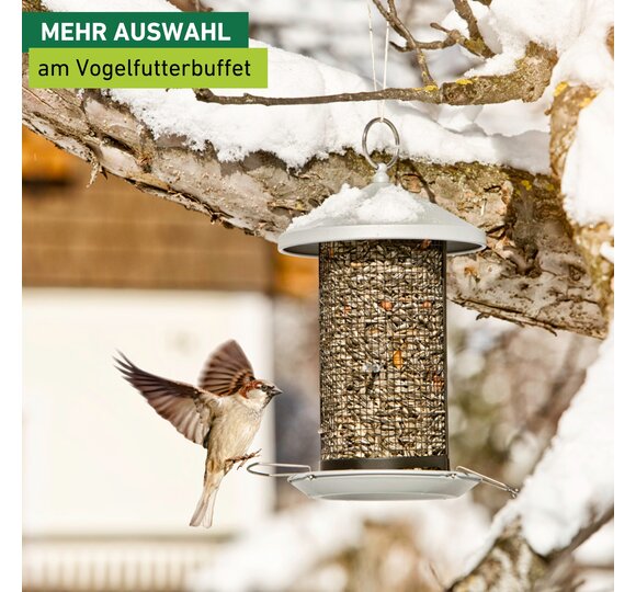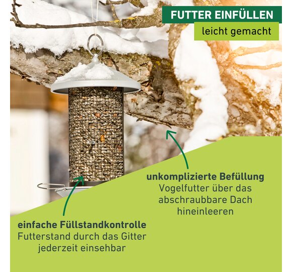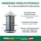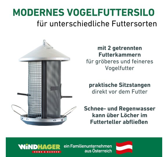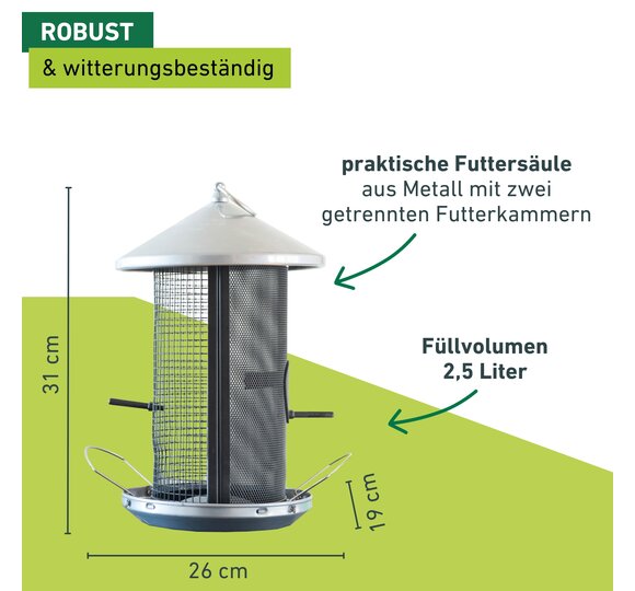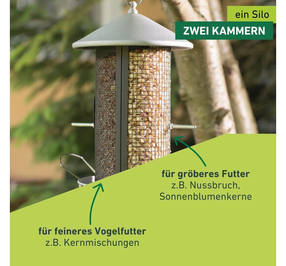 The highly weather-resistant feed silo does its job all through winter. It is divided into two separate feed chambers which are suitable for larger feed (e.g. nuts, sunflower seeds) and smaller feed. Drainage holes in the feed bowl allow the water to drain off and keep the feed dry. Painted in modern colours of black and silver.