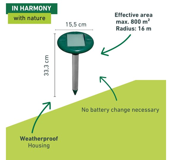 The use of devices to drive away uninvited guests is the animal-friendly option of pest control and an ideal solution for everyone who deliberately wants to avoid the use of chemicals and poisons. It protects your property, but nature and animals as well.