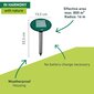 Under optimal conditions - hard ground, free space - the device has an effective area of up to 800 m2. Soft, loose soil (such as in flowerbeds) shortens the effective area, as the sound waves are not transmitted as far. In this case, or for larger surfaces, it is advisable to use several devices at the same time. In order to track and mark the tunnels, you can use Windhager marker flags (05317). Once the tunnels have been found, the repellent only needs to be inserted into the ground at the desired location and it is immediately ready for use. Place the vole and mole repellent SOLAR next to the animal's tunnel, not directly into it, as this is the only way to ensure the maximum reach.