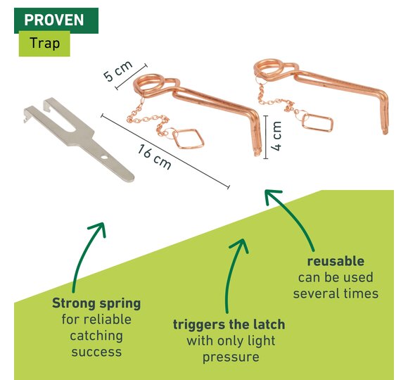 Voles are undesirable guests in the garden - they not only devastate the lawn, but can also ruin the vegetable harvest. Put an end to it all with the proven SUPER STRONG vole trap. With this high-quality and durable trap with a particularly strong spring, you can catch voles effectively and reliably. The trap is triggered by a slight pressure. After a successful catch, the vole trap can be immediately used again thanks to the reusable plates.