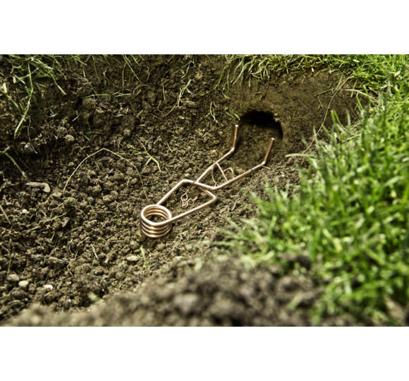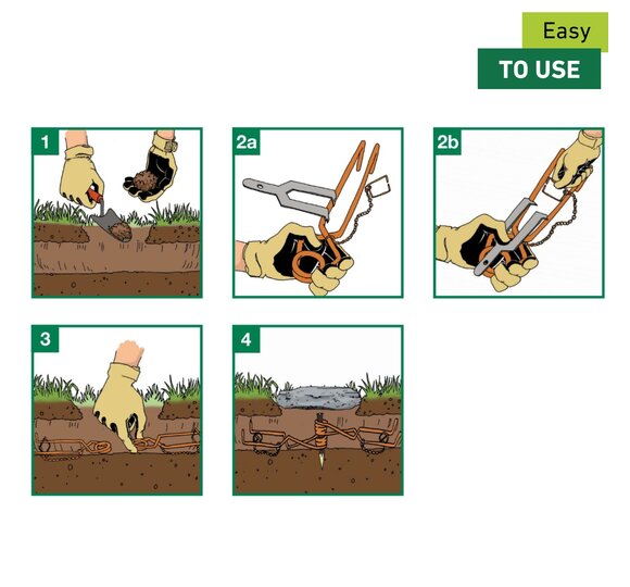 After a vole tunnel has been found, the trap only needs to be placed. The trap SUPER STRONG should be placed about 10 cm below the surface of the earth. Then the hole must be covered again. For example, the previously removed sward or a bucket can be used for this purpose. In addition, the place where the trap is located can be marked with a flag (item no. 05317). This makes it easier to find the vole trap again afterwards.