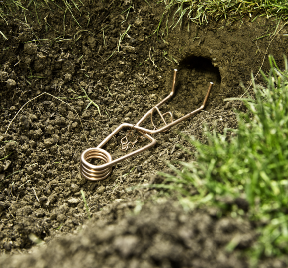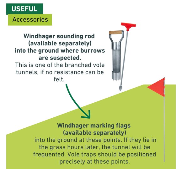 Use the sounding rod VOLE TRAP ACCESSORIES (item no. 05316) to dig into the ground where tunnels are suspected to be present. If no resistance can be felt, it is probably one of the branched vole passages. Mark these places with the Windhager marker flags (item no. 05317). If these lie in the grass a few hours later, the tunnel is being used. Vole traps should be positioned precisely in these places.