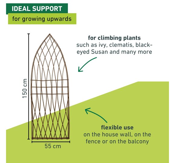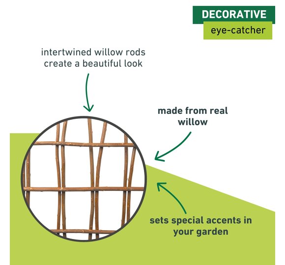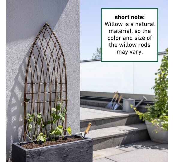 Whether on the house wall, fence or balcony: the versatile trellis, made from natural willow, always cuts a fine figure. It offers climbing plants such as ivy or clematis an ideal area to grow upwards, making it an attractive eye-catcher in its location. Densely overgrown, this natural climbing aid also proves to be an attractive privacy shield for gardens and patios, providing more privacy and security.