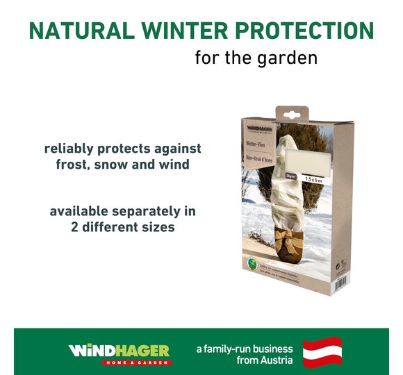 This winter protection product is the right choice for all gardening enthusiasts who value sustainability. At the same time, it offers the advantages of a classic winter protection: it is lightweight and flexible, adapts well and protects your plants in winter against cold, wind and sun. The winter protection can be quickly wrapped around the plants and then secured with a tie cord, for example made of jute or sheep’s wool, from the Windhager range. The winter fleece has a weight of 30 g/m² and is available in two different sizes.