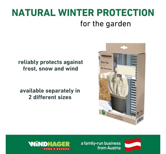 This winter protection product is the right choice for all gardening enthusiasts who value sustainability. At the same time, it offers the advantages of a classic winter protection: it is lightweight and flexible, adapts well and protects your plants in winter against cold, wind and sun. The winter protection can be quickly wrapped around the plants and then secured with a tie cord, for example made of jute or sheep’s wool, from the Windhager range. The winter fleece has a weight of 30 g/m² and is available in two different sizes.