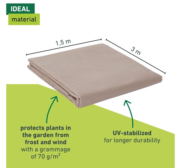 The fleece provides especially high protection against frost, snow and wind, and is particularly suitable for sensitive plants and low temperatures. UV-stabilized.