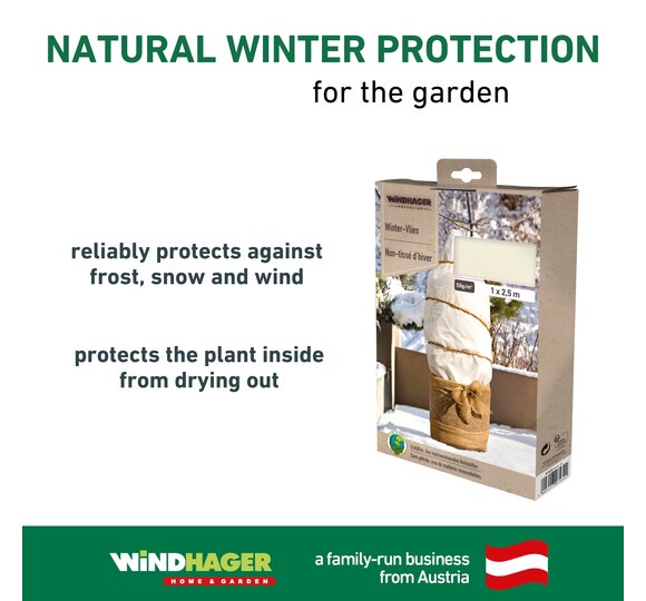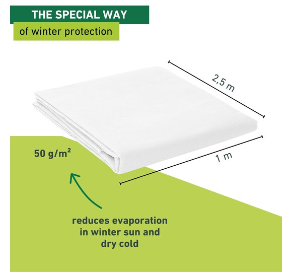 This winter protection product offers the advantages of classic winter protection: it helps prevent frost damage and protects against drying out caused by cold, wind and sun. The winter fleece can be quickly wrapped around the plants and then secured with a tie cord, for example made of jute or sheep’s wool. With a weight of 50 g/m², the fleece provides good protection at low temperatures.