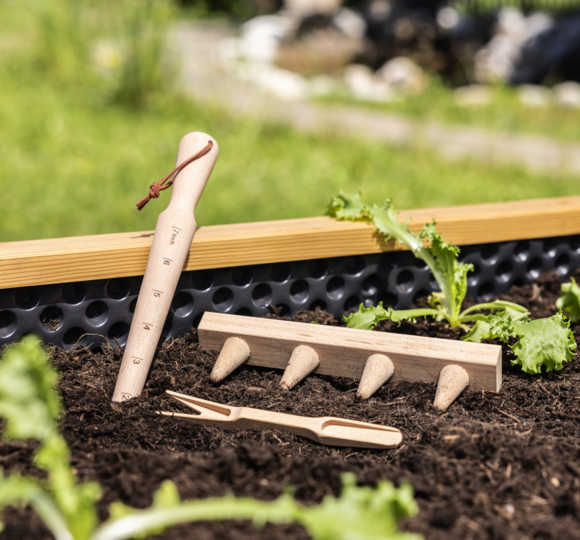 The pricking fork is used to transplant the delicate seedlings without damaging the roots. The second side of the pricking fork can also be used to carefully fill the previously created holes with soil and press down lightly.