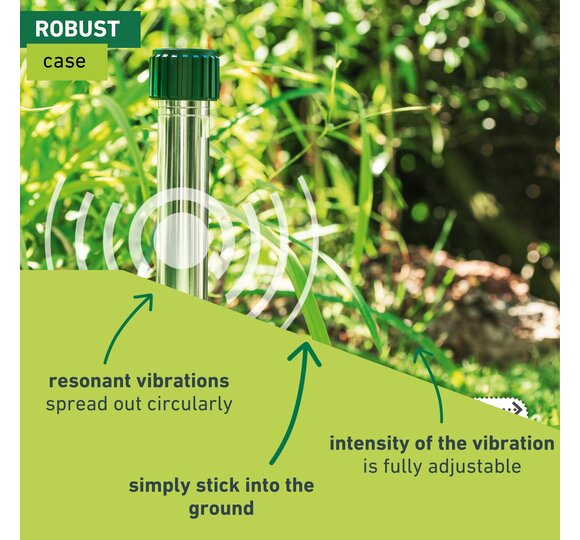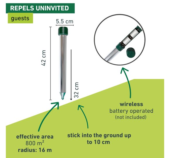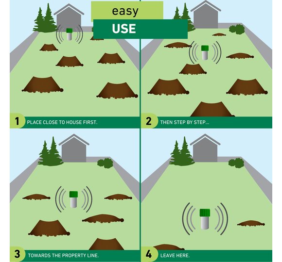 - EFFECTIVELY DISPERSES MOLES AND VOLES - The device emits low-frequency sound waves, which drive the animals away in an area of up to 800 m2