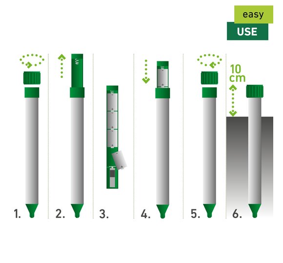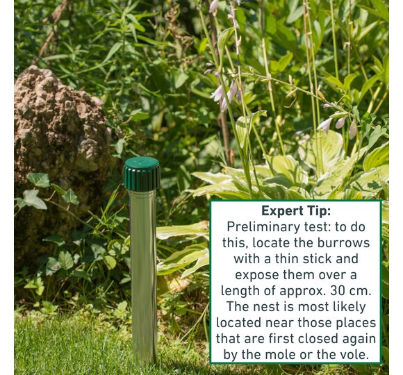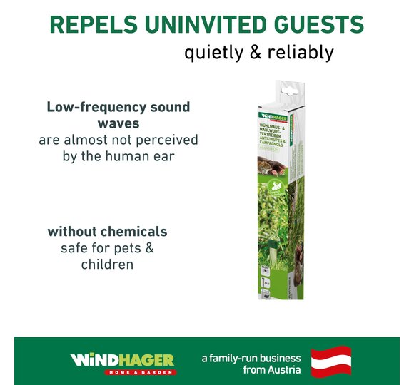 In optimal conditions - hard ground, open space - the device has an effective area of up to 800 m2. Soft, loose soil (such as in flowerbeds) shortens the effective area, as the sound waves are not transmitted as far. In this case, or for larger surfaces, it is advisable to use several devices at the same time. In order to track and mark the tunnels, you can use Windhager marker flags (05317). Once the tunnels have been found and the batteries inserted, the repellent only needs to be inserted into the ground at the desired location and it is immediately ready for use. Place the vole and mole repellent ALUMINIUM next to the animal's tunnel, not directly into it, as this is the only way to ensure the maximum reach.