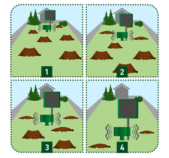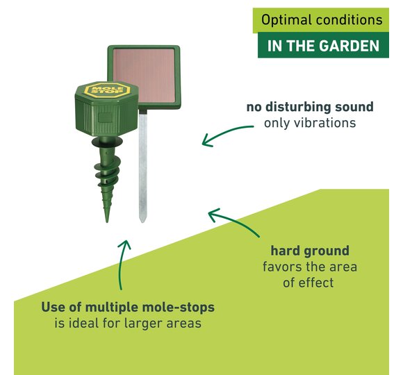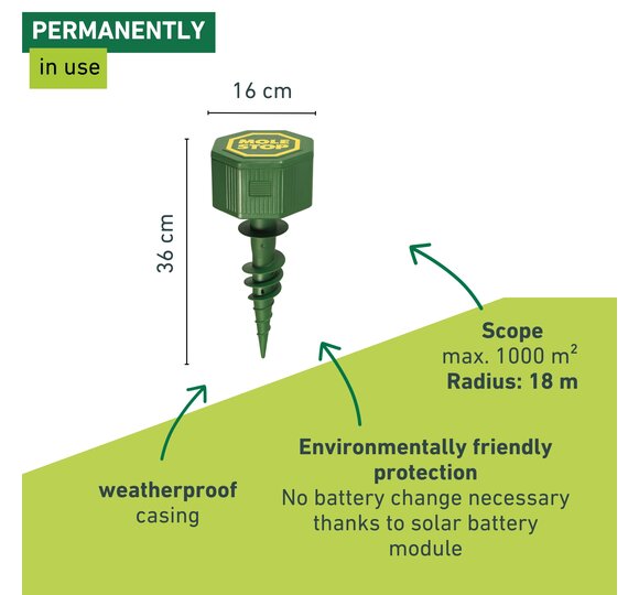 The MOLE STOP SOLAR works without any noise and it only uses vibrations. The device emits intermittent vibrations that are transmitted to the ground and disrupt the sense of direction of the moles and voles. The animals can no longer find their tunnels or have no idea in which direction to dig. Therefore, they leave the disturbance range. The special feature of this device - in contrast to comparable devices on the market - is the absence of annoying sounds.