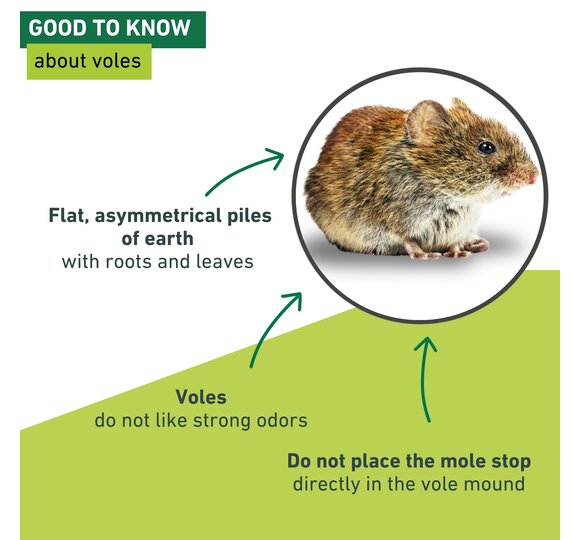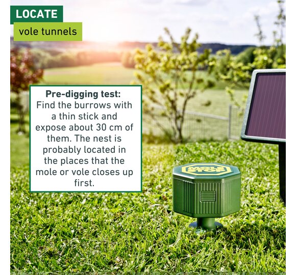 The MOLE STOP should be placed next to the mole/vole tunnel, not directly into it. In order to track and mark the tunnels, you can use Windhager marker flags (05317).