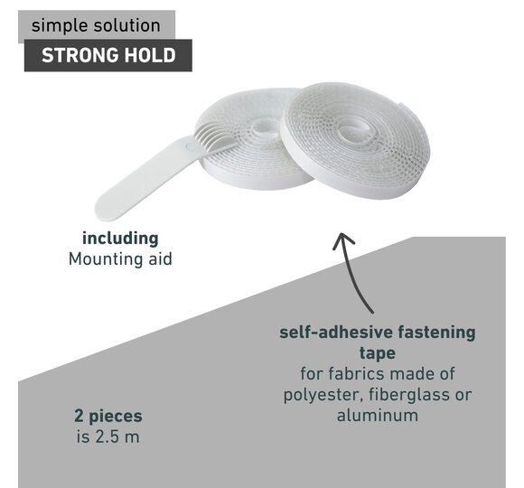 - Contents: 2 pieces of fixing tape à 2.5 m incl. tools