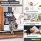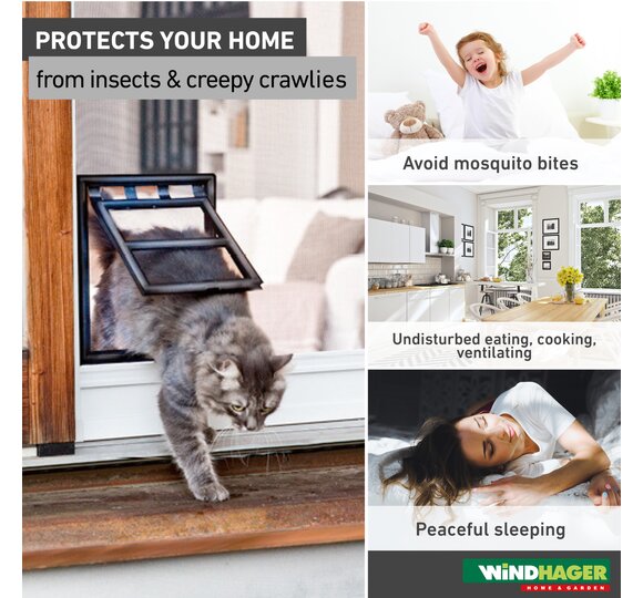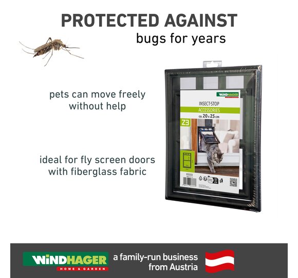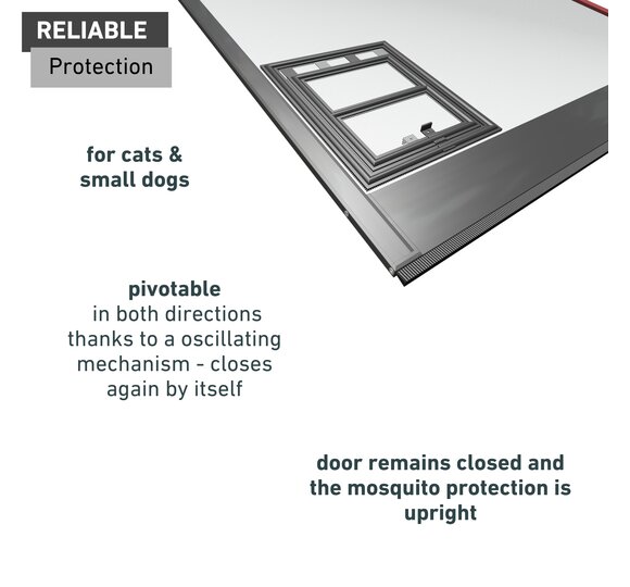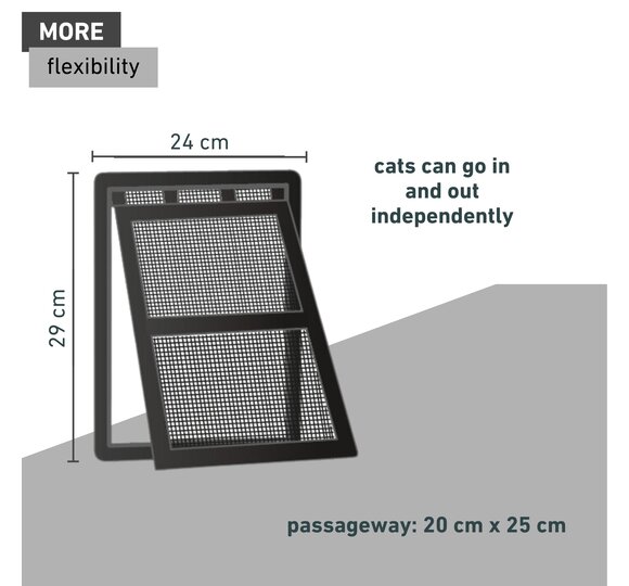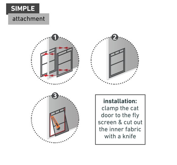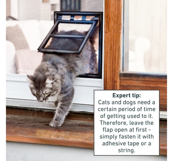 This is a highly convenient accessory for all owners of cats and small dogs - the pet can pass through any time thanks to a oscillating mechanism without having to open the insect screen door. To mount it, it is clamped onto the fly screen; the inner fabric is being cut out with a knife.
