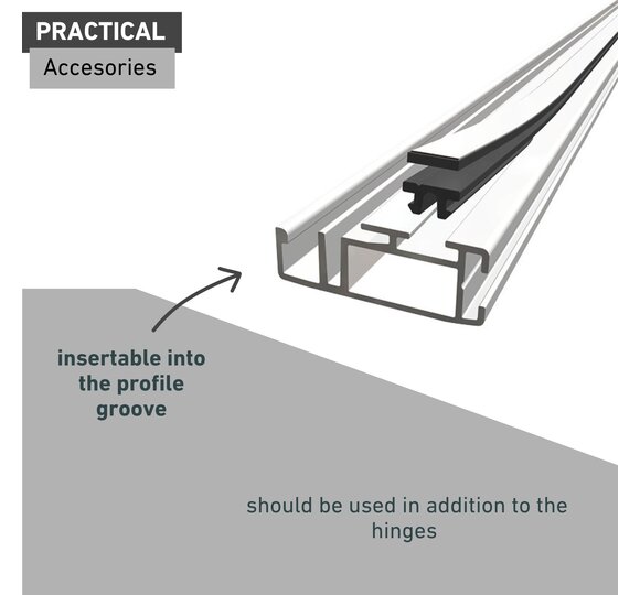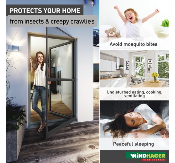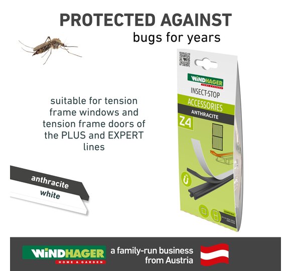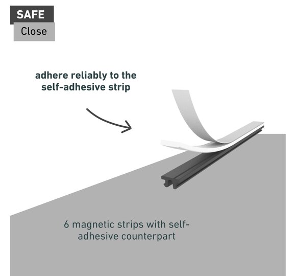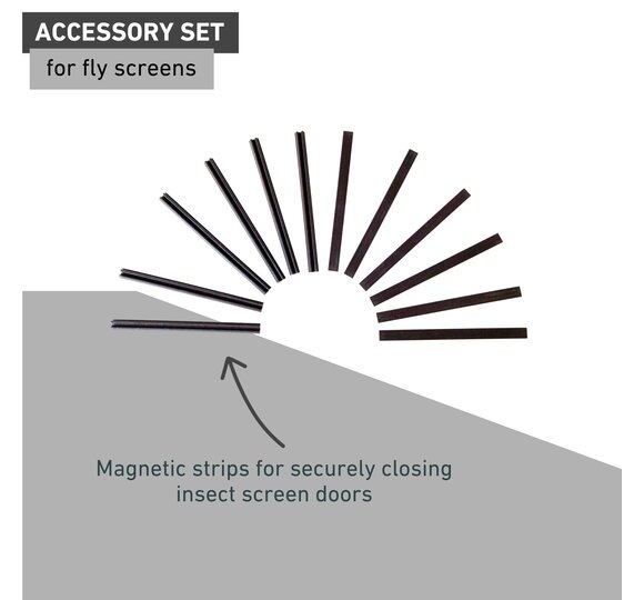 The strips are pushed into the profile groove and stick reliably to the self-adhesive counter-plate. The magnetic strips should be used in addition to the hinges. The insect screen door thus remains safely closed at all times and prevents mosquitoes from entering through small crevices.