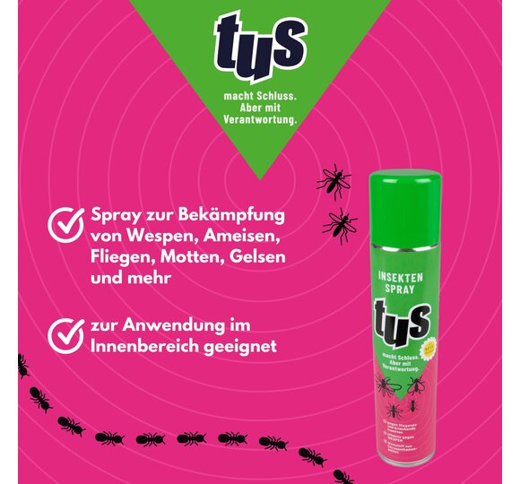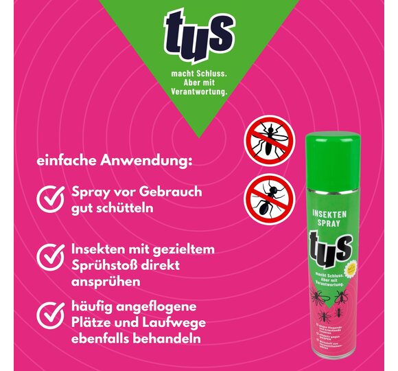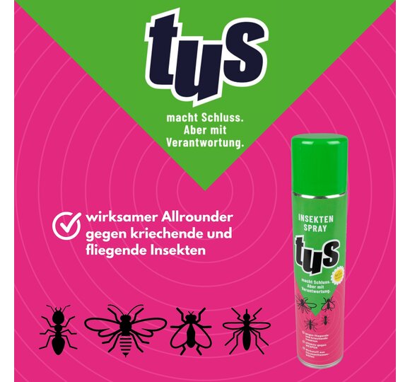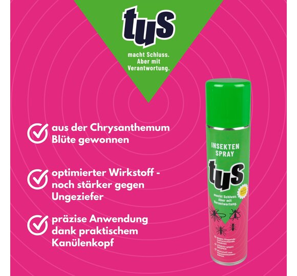 Auf der Suche nach Nahrung oder aus Schutz vor Kälte finden Insekten aller Art oftmals ihren Weg ins Haus oder die Wohnung. Damit sich diese unbeliebten Gäste nicht dauerhaft einnisten und vermehren, ist schnelles Handeln erforderlich. Der praktische Insektenspray von tus ist ein zuverlässiger Partner im Einsatz gegen fliegende und kriechende Insekten wie Wespen, Ameisen, Fliegen, Motten, Gelsen und mehr. Dank der effizienten Spraydose mit Kanülenkopf lässt sich der Wirkstoff, gewonnen aus Chrysanthemum-Blüten, präzise dosieren und gezielt anwenden. Diese Insektenabwehr ist für den Gebrauch in Innenräumen geeignet.
