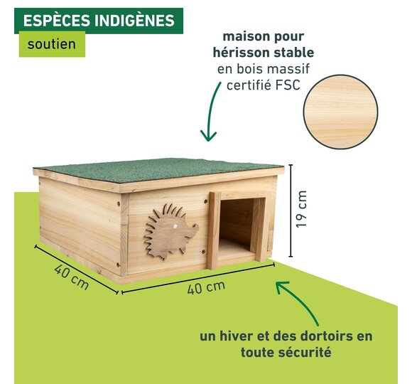 - ABRI HIVERNAL SOLIDE POUR HÉRISSONS - Cet abri solide pour hérissons, en bois massif certifié FSC, offre aux animaux un refuge sûr pour l’hiver et pour la nuit