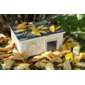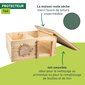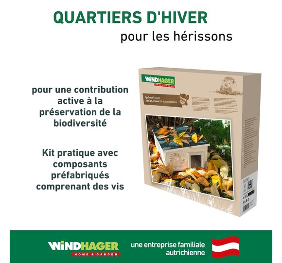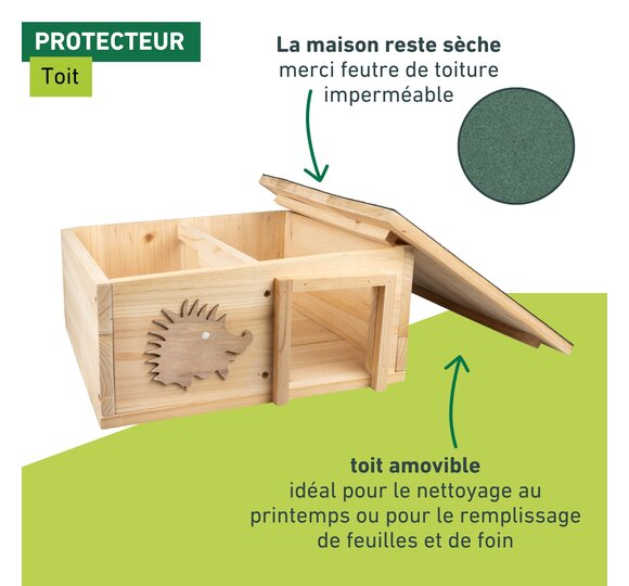 L’abri, en bois massif certifié FSC, est doté d’un toit en carton imperméable qui protège de l’humidité due à la pluie et à la neige. Un cloison intérieure spéciale garantit la sécurité des hérissons et empêche d’autres animaux, comme les chats, de s’introduire dans l’abri. Le toit amovible permet le nettoyage au printemps et l’approvisionnement en feuilles ou en foin.