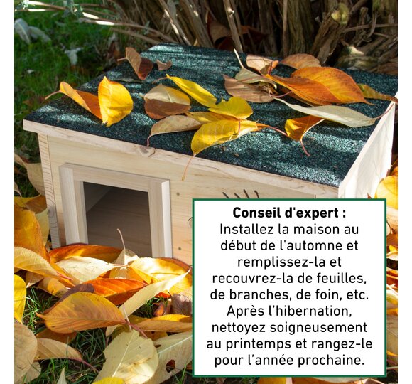 En automne, le hérisson fait ses réserves de nourriture en vue de l’hiver, puis part à la recherche d’un abri sûr. Installez donc le refuge au début de l’automne et remplissez-le généreusement de feuilles, de branches, de foin ou de paille. Le toit doit également être recouvert de brindilles et de branches pour que le hérisson se sente chez lui. Une fois son nid terminé, il entre en hibernation et ne quitte plus l’abri jusqu’au printemps. Durant cette période, il a besoin de calme et ne doit pas être dérangé. Ce n’est qu’à la fin du printemps, lorsque le hérisson est parti, que l’abri peut être nettoyé et rangé jusqu’à sa prochaine utilisation.