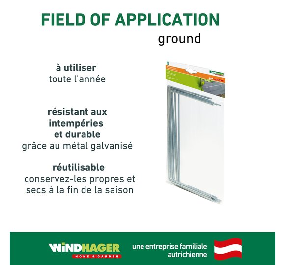 Les solutions de fixation simples des films et des voiles restent solidement ancrées dans le sol et constituent un moyen de fixation sûr. Tandis que les tuteurs évitent que les filets et les plantes n’entrent en contact direct, les protégeant ainsi contre les dommages, les piquets maintiennent fermement en place les tapis de mauvaises herbes, bâches en tissu, films pour parterres et filets dans le sol.