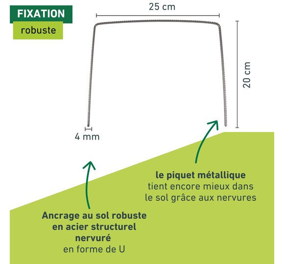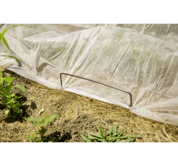 Les agrafes métalliques en acier de construction nervuré conviennent pour la fixation des voiles de croissance et des films les plus variés. Qu’il s’agisse de toiles de paillage ou de tissus géotextiles : l’agrafe métallique leur fournit le support adéquat dans le sol. Grâce à ses nervures, l’agrafe tient encore mieux dans le sol.