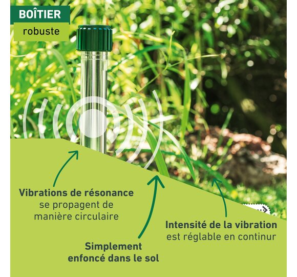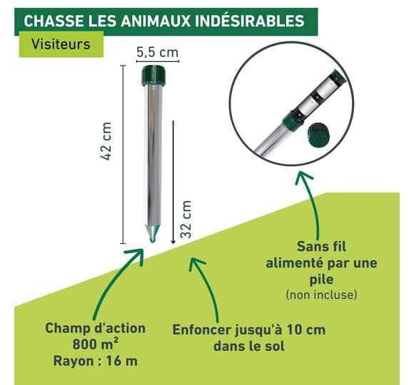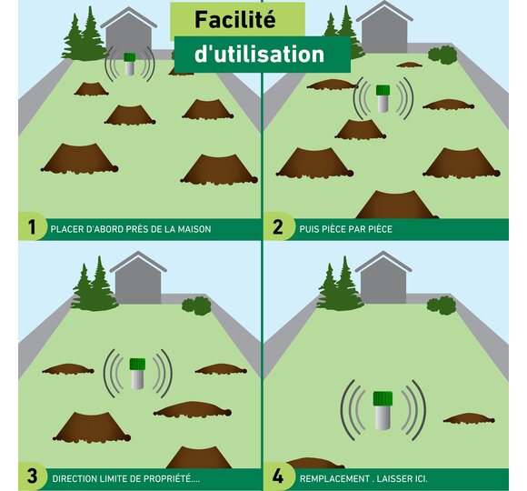 - EXPULSE LES TAUPES ET LES CAMPAGNOLS EFFICACEMENT – L’appareil émet des ondes sonores à basse fréquence qui font fuir les animaux dans un rayon d’efficacité pouvant atteindre 800 m2
