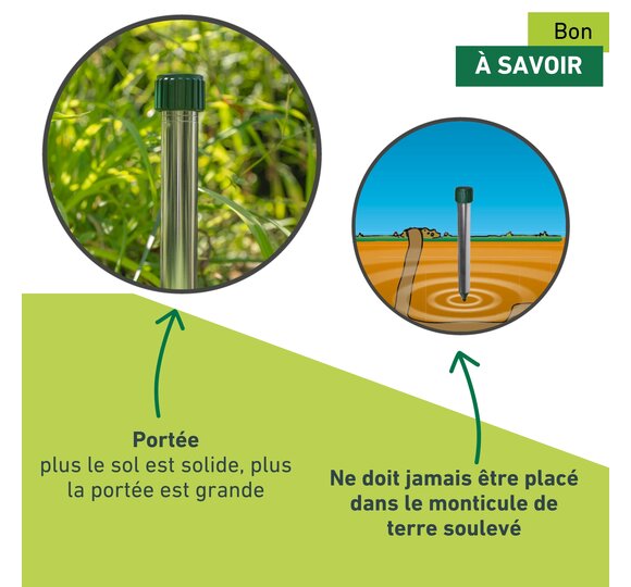 Dans des conditions optimales – sol dur, espace ouvert – l’appareil a un rayon d’efficacité allant jusqu’à 800 m2. Un sol mou et meuble (par exemple, dans les parterres de fleurs) réduit l’efficacité de l’appareil, car les ondes sonores ne peuvent pas émettre aussi loin. Dans ce cas, ou en cas de surfaces plus importantes, l’utilisation simultanée de plusieurs appareils est recommandée. Les fanions de balisage Windhager (05317) sont utilisés pour repérer et marquer les galeries creusées. Une fois les galeries localisées et les piles insérées, il suffit d’enfoncer l’appareil dans le sol à l’endroit souhaité pour qu’il soit immédiatement prêt à l’emploi. Placez l’appareil anti-taupes et campagnols ALUMINIUM à côté de la galerie creusée par l’animal, et pas directement dedans, afin d’atteindre une portée maximale.