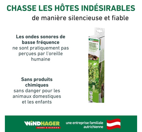 Le Mole Stop 1000 a été le premier produit que Windhager a mis sur le marché – et il a toujours du succès, car il fonctionne ! Ainsi, la gamme de produits offre une grande variété de possibilités pour chasser les taupes et lutter contre les campagnols.