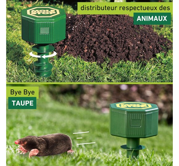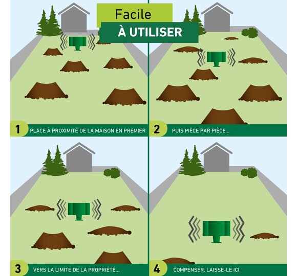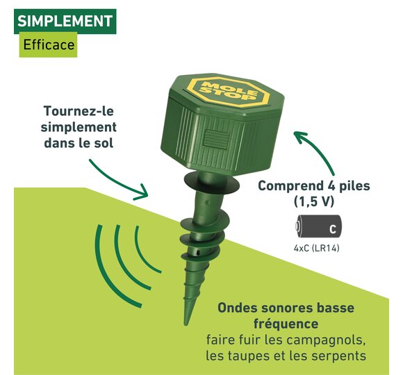 • EFFICACE ET RESPECTUEUX DES ANIMAUX – Les vibrations intermittentes affectent le sens de l’orientation des taupes et des campagnols et les font fuir sans les blesser