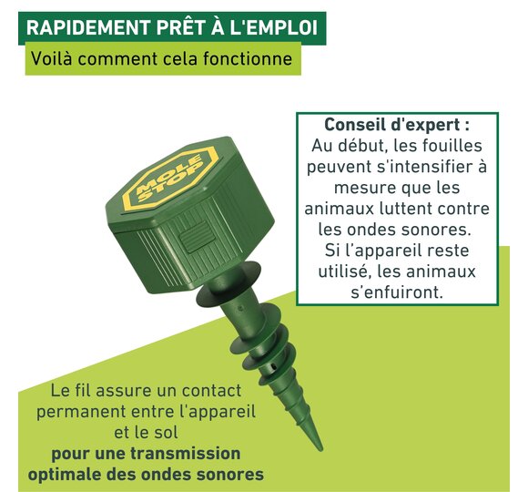 L’appareil MOLE STOP fonctionne de façon totalement silencieuse, il émet uniquement des vibrations. L’appareil émet des vibrations intermittentes qui sont transmises dans le sol et affectent le sens de l’orientation des taupes et des campagnols. Les animaux ne trouvent plus leurs galeries ou ne savent plus dans quelle direction creuser. Ils quittent donc la zone. La particularité de cet appareil – par rapport aux appareils comparables sur le marché – est qu’il n’émet aucun son gênant.