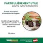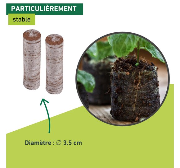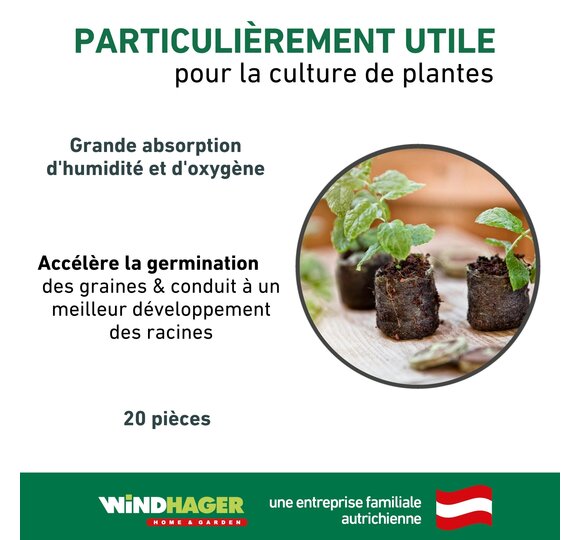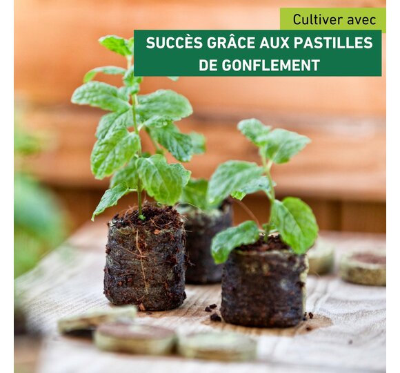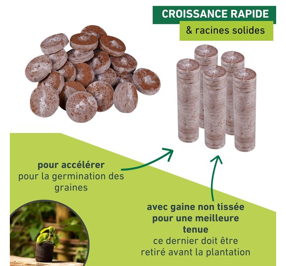 Les fibres de coco des pastilles de culture se caractérisent par une meilleure absorption de l’humidité. Cela engendre une germination plus rapide et un développement plus solide des racines. Ainsi la croissance des plantes est favorisée et une formation précoce des fleurs et des fruits est possible. Entourées de fines mailles de coton.