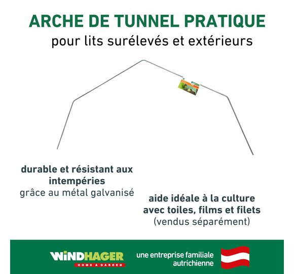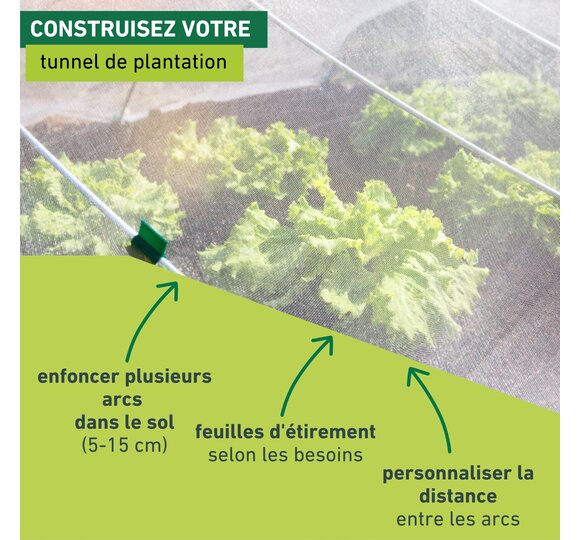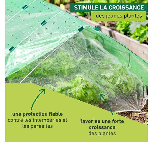 Recouvert d'un filet contre les insectes, la grêle ou un filet anti-oiseaux, le tunnel offre une protection fiable contre les nuisibles et les intempéries. Galvanisé. Voiles, films et filets disponibles séparément.