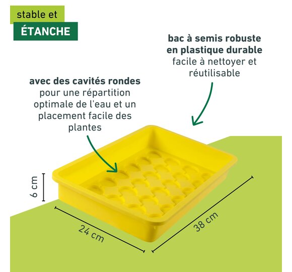Ce bac de culture aux couleurs vives peut accueillir jusqu'à 28 plants. Les cavités rondes dans le fond assurent une répartition optimale de l'eau et permettent de placer facilement les plants, par exemple dans des pastilles de germination. Le bac à semis étanche est polyvalent et peut accueillir des pots de culture, de la terre de culture ou des tablettes de gonflement. Fabriqué en plastique durable, il est facile à nettoyer et peut être utilisé pendant plusieurs années.