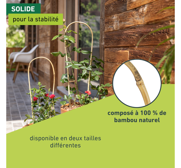 Le tuteur arceau est composé à 100 % de bambou naturel à croissance rapide. Matériau naturel, le bambou est recyclable et peut être utilisé en toute bonne conscience dans votre jardin.