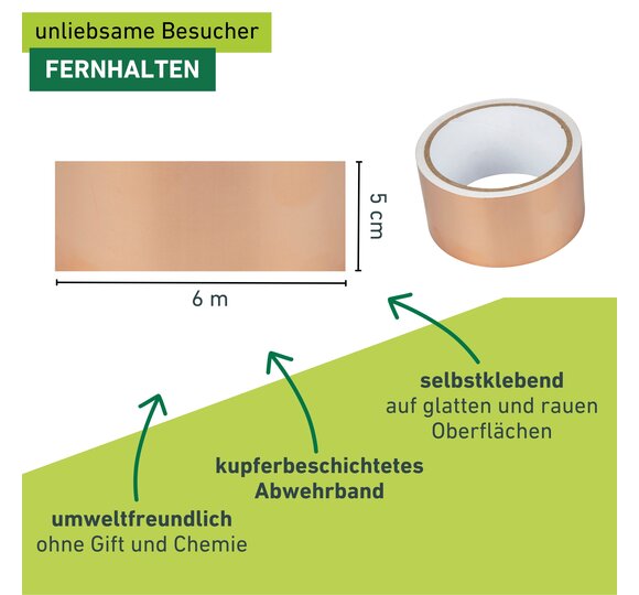 Grâce à sa surface autocollante au verso, le ruban de cuivre se fixe rapidement et sans effort sur les pots, les serres et les plate-bandes de différente taille pour une protection parfaite de vos plantes. Après la mise en place, bien mouiller le ruban pour permettre l’apparition d’une couche d’oxyde.