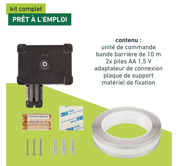 - PRÊT À L’EMPLOI – Kit complet avec une bande barrière de 10 m (pouvant être raccourcie individuellement), unité de commande, 2x piles AA 1,5 V, adaptateur de connexion, plaque de support, matériel de fixation