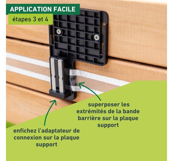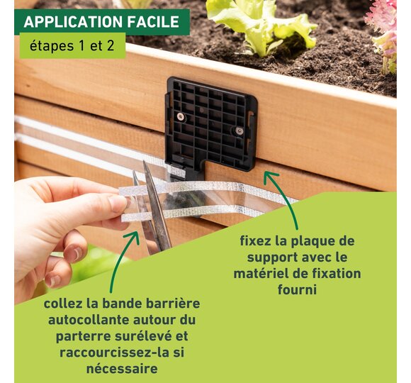 - Collez la bande barrière autocollante tout autour du parterre surélevé en faisant chevaucher les extrémités sur la plaque de support et, si nécessaire, raccourcissez ce qui dépasse avec des ciseaux.