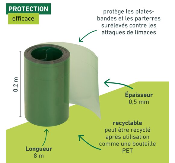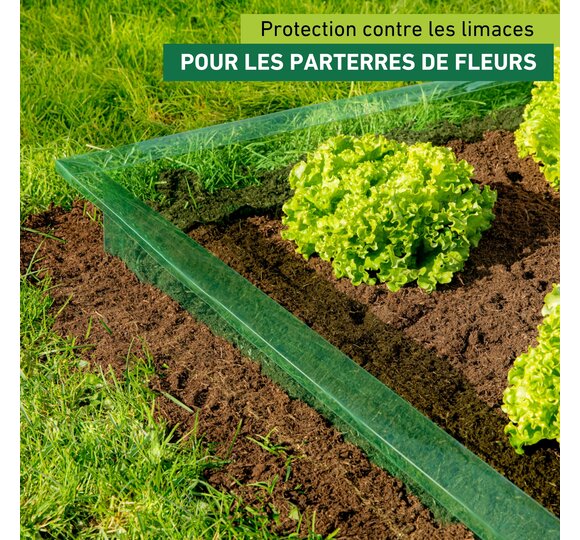 Le système anti-limaces est composé d’un plastique PET recyclable, résistant aux intempéries avec deux bords pliés. La barrière à limaces vous aide à lutter contre ces nuisibles. Découpez quatre bandes dans la longueur requise, faites des entailles et emboîtez-les. Et voilà votre système anti-limaces, efficace quel que soit le temps qu’il fait. Les limaces ne passeront pas !