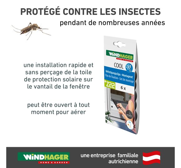 L'une des caractéristiques les plus remarquables du tissu de protection solaire COOL de Windhager est sa polyvalence. Il peut être parfaitement intégré dans un cadre de moustiquaire ou être directement fixé sur le cadre de fenêtre à l'aide de clips de fixation. Cette flexibilité permet une installation simple et rapide, afin que vous puissiez profiter immédiatement des avantages d'un espace de vie protégé et plus frais.