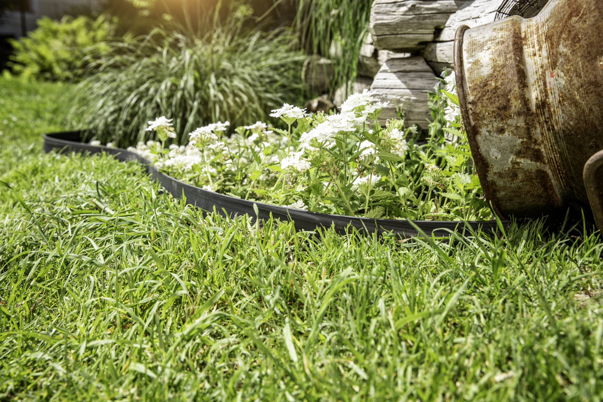 Flexible et robuste en même temps. N’éclate et ne rompt pas. La bordure de gazon est simplement incurvée dans la forme souhaitée. Cela vous donne de la liberté pour la conception de d’arcs et de courbes, de droites ou d’angles droit. Aucune limite n’est posée à votre vision. La bordure de gazon empêche la croissance illimitée du gazon et se présente comme une barrière entre le gazon et p. ex. les platebandes de fleurs. Elle peut être écrasée sans problème par la tondeuse. Pour un mode d’action idéal, la bordure doit dépasser d’environ 1-2 cm de la terre.