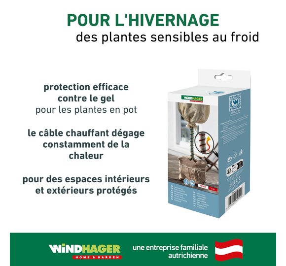 Câble chauffant idéal pour l’hivernage sans problème des plantes en pot sensibles telles que les palmiers. Enroulé plusieurs fois autour du pot, le câble chauffant restitue une chaleur constante. Cet apport de chaleur est particulièrement efficace sous une natte d’hivernage en coco ou en laine de mouton ou encore sous une protection d’hivernage pour pot. Placée dans un endroit abrité (garage, tente de protection hivernale, serre, abri de jardin lumineux), la plante passera l'hiver sans gelure.