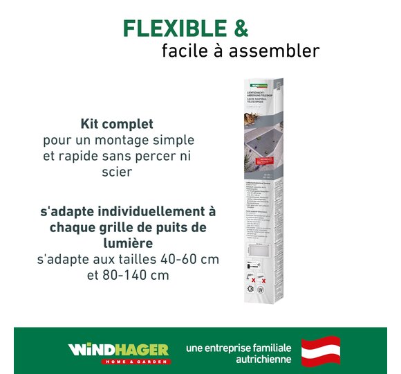 Les cadres de recouvrement pour puits de lumière ne tiennent pas seulement les feuilles, les pierres et les grosses saletés à l'écart. Ils veillent également à ce qu'aucun animal ne s'égare dans le soupirail et ne pénètre éventuellement dans la maison. La couverture de puits de lumière télescopique de Windhager a un autre avantage : il n'est pas nécessaire de prendre la scie pour découper les profilés du cadre. Ceux-ci s'étendent ou s'assemblent très facilement à la taille souhaitée.