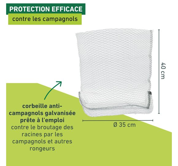 - PRÊT À L’EMPLOI - La corbeille anti-campagnols prête à l’emploi est directement enterrée dans le sol avec la motte de racines.