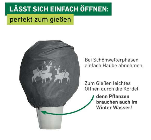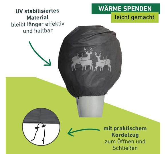 Cette housse hivernale en voile de croissance protège les buissons, les plantes en bac et en pot contre le gel, le vent et la pluie. Mais l’assaut de l’hiver est souvent brusque et inattendu. Cela signifie que plus vite les plantes sont protégées, mieux cela vaut. La housse peut être posée très simplement : il faut juste la rabattre sur la couronne de la plante. Elle est tout aussi facile et rapide à fixer : il suffit de tirer sur le cordon.