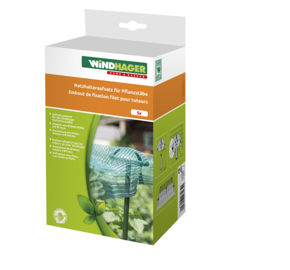 Le recouvrement pénible d’arbustes fruitiers et de plates-bandes, par ex., pour les protéger des oiseaux, insectes, etc. est véritablement facilité par une nouvelle construction. L’utilisation d’une fixation de filet en combinaison avec un tuteur pour plante permet que le filet ne soit plus posé directement sur la plante. La fixation de filet peut être tendue entre autres avec des filets de protection contre la grêle, les oiseaux, le feuillage et les insectes. Le filet est accroché et tendu à l’aide des ergots sur l’hémisphère intérieure. La soucoupe est adaptée au tuteur de plante en acier de Windhager : la fixation de filet convient aux tuteurs de plantes avec Ø16mm, les tuteurs de plantes avec Ø11mm peuvent parfaitement être utilisés avec un adaptateur.