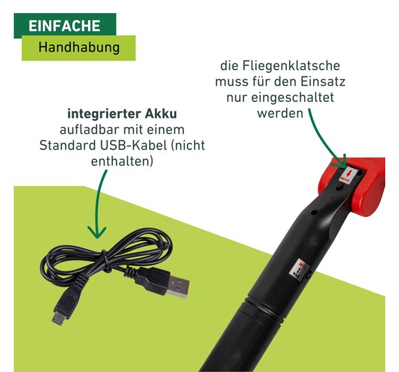 La raquettes à insectes électrique peut être rechargée avec un câble USB standard (non inclus) au niveau de l’extrémité inférieure de la poignée. Une fois la batterie intégrée chargée, la raquette à insectes est immédiatement prête à être utilisée. Elle peut être allumée et éteinte sur le côté de la poignée. Une fois que vous avez un insecte en ligne de mire, il vous suffit de le toucher avec la raquette préalablement allumée – l’insecte volant sera tué en un éclair par simple contact avec le grillage sous tension.