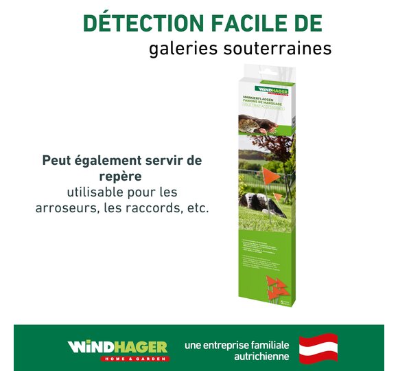 Un jardin envahi par les taupes et campagnols qui y creusent des galeries est agaçant. Heureusement, avec les pièges de Windhager, les taupinières et les racines rongées appartiendront bientôt au passé. Il n’est pas si aisé de rechercher des galeries souterraines pour y poser des pièges lorsqu’on ne dispose pas des bons outils. Grâce aux fanions de balisage et au kit composé d’une sonde et d’une tarière (réf. 05316) disponible séparément, la recherche de telles galeries devient un jeu d’enfant. Par ailleurs, les fanions de balisage pratiques peuvent également être utilisés à d’autres fins, comme le marquage des arroseurs ou des raccordements d’eau.