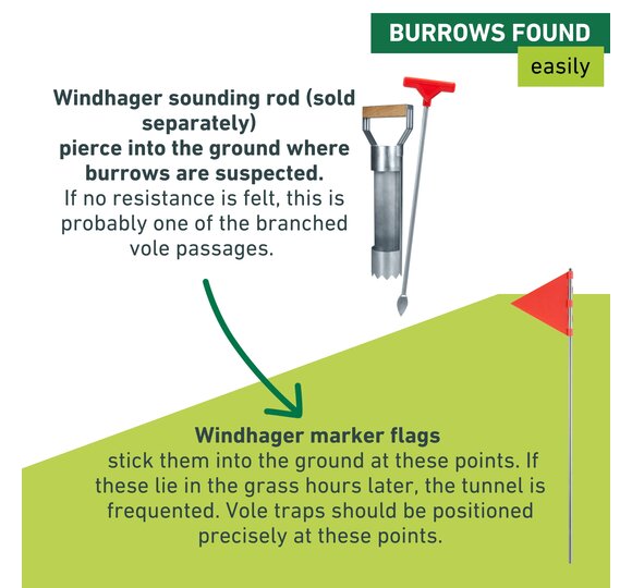 Enfoncez la tarière VOLE TRAP ACCESSORIES de Windhager (réf. 05316) dans le sol, à l’endroit où se trouvent les galeries. Si vous ne ressentez aucune résistance, vous êtes probablement tombé sur une galerie. C’est maintenant que les fanions de balisage entrent en jeu. Marquez, à l’aide des fanions, les endroits où vous ne ressentez aucune résistance. Si ceux-ci tombent dans l’herbe quelques heures plus tard, cela signifie que la galerie abrite des visiteurs. Les fanions doivent être positionnés exactement à ces endroits.