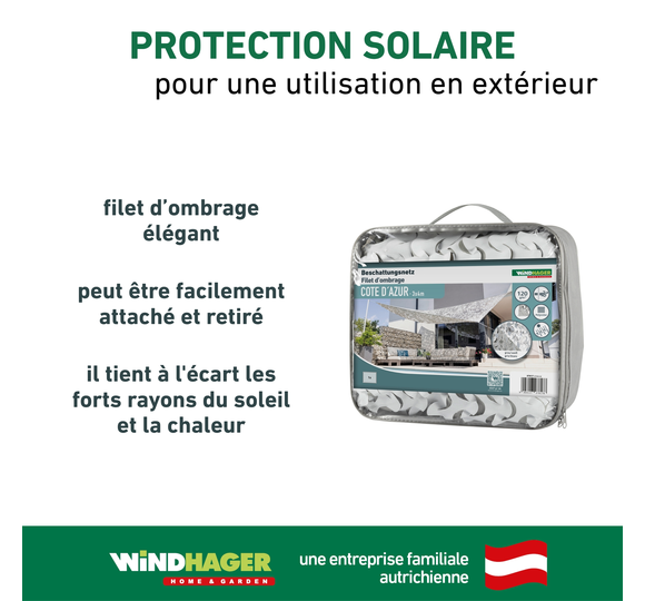 Remarque : le filet d'ombrage doit être retiré en cas de vent fort afin de le protéger contre les dommages. Après la saison estivale, il est idéalement stocké dans un endroit sec. Une utilisation permanente, tout au long de l'année, n'est pas recommandée.
